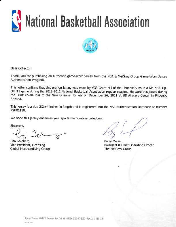 サイズは3XL+4と特大で、ヒルの体格に合わせて特別に製作されたものです。MeiGrayによる厳格な認証を受けており、その真贋性は揺るぎません。2011-12シーズンはヒルのサンズでの最後のシーズンとなり、このジャージはその貴重な時期の証人となっています。